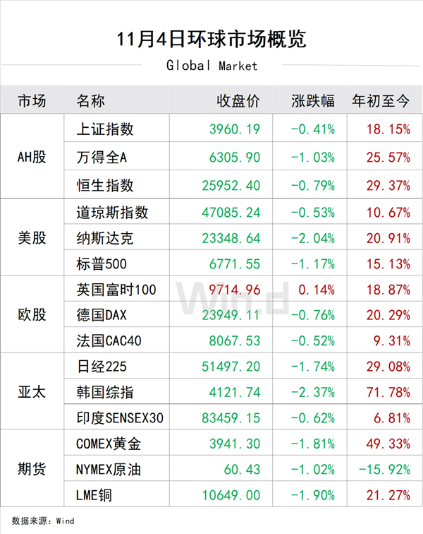 1、美国三大股指全线收跌,道指跌0.53%,标普500指数跌1.17%,纳指跌2.04%。卡特彼勒跌超4%,英伟达跌近4%,领跌道指。万得美国科技七巨头指数跌1.93%,特斯拉跌超5%,谷歌跌逾2%。中概股普遍下跌,小马智行跌近10%,世纪互联跌超8%。科技股跌幅领先。华尔街著名大空头警告AI泡沫。投资者担忧近期领涨的AI个股估值过高,英伟达与Palantir遭到做空。高盛和摩根士丹利双双警告美股可能回调。美国政府停摆进入第35天。