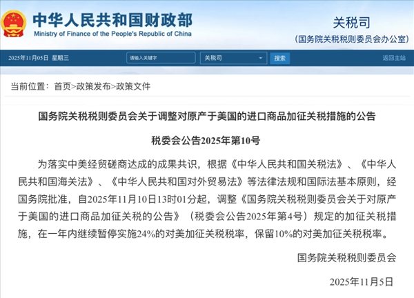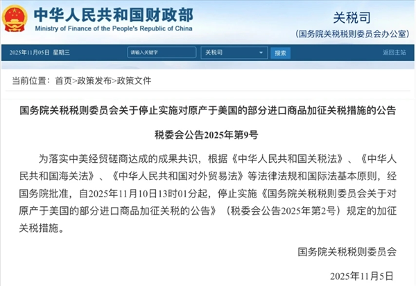 11月5日,财政部在网站发布2025年第9号、第10号公告,停止实施对原产于美国的部分进口商品加征关税措施、调整对原产于美国的进口商品加征关税措施。