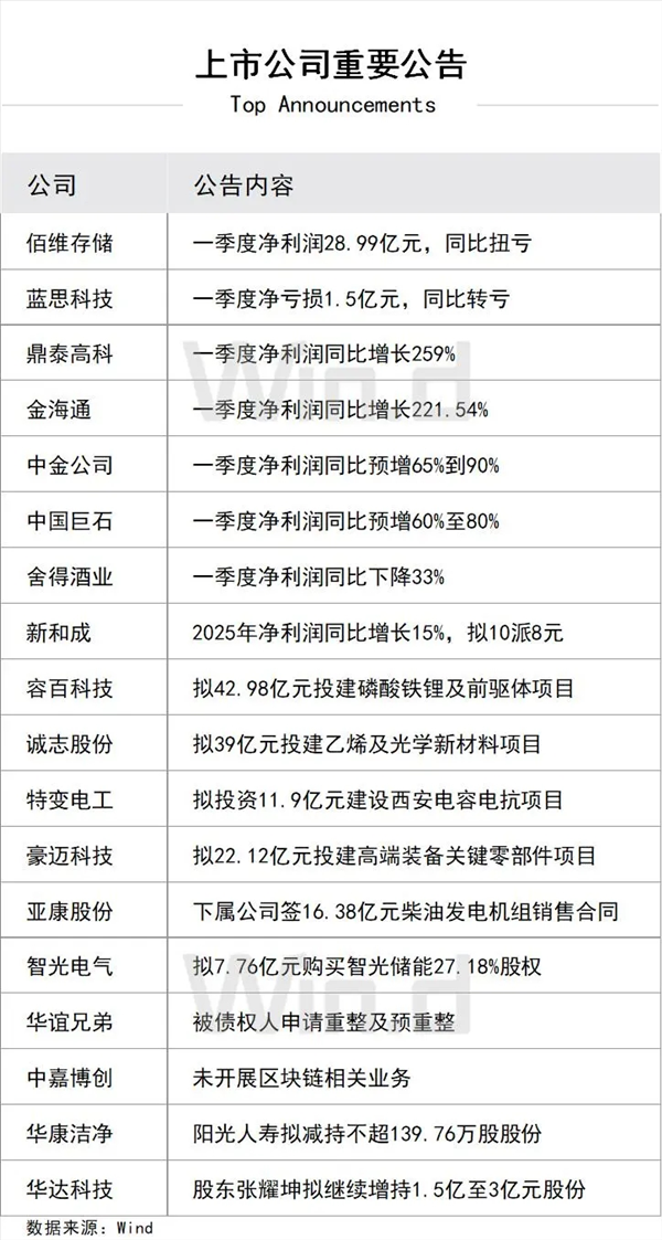 4、宁德时代一季度实现营业收入1291.31亿元,同比增长52.45%;净利润207.38亿元,增长48.52%。宁德时代同时公告,拟设立时代资源集团,作为公司新能源矿产领域的专业投资运营与管理平台,注册资本300亿元。