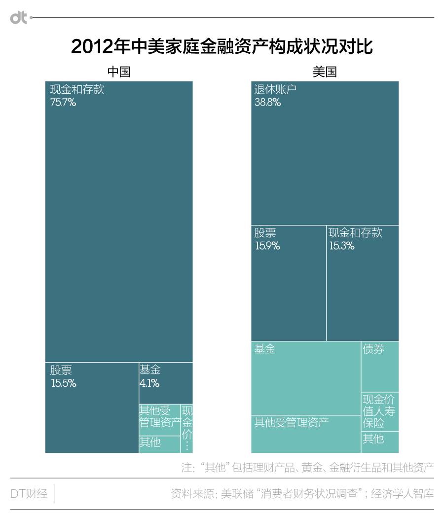 经济学人智库在报告中引用了美国德州农工大学的甘犁教授和西南财经大学共同实施的“中国家庭金融调查”(CHFS)结果称,2012年中国家庭持有的金融资产平均价值为12万元,其中76%为现金和活期存款。对比而言,美国家庭的金融资产持有更多元化,配比也更平均。