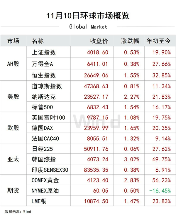 3、美油主力合约收涨0.5%,报60.05美元/桶;布伦特原油主力合约涨0.5%,报63.95美元/桶。美国政府停摆危机缓解提振市场风险偏好,叠加地缘冲突持续为油价注入风险溢价,推动布伦特原油价格上涨。