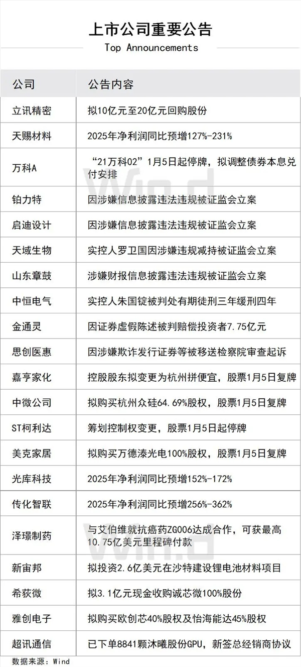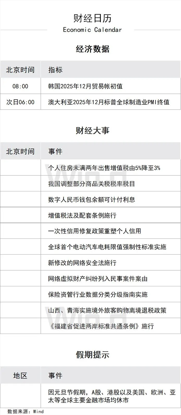 1、现券期货整体偏弱,国债期货全线收跌,30年期主力合约跌0.35%;银行间主要利率债收益率走势分化,10年期“25附息国债16”收益率下行1bp报1.85%。央行开展5288亿元逆回购操作,净投放5028亿元,资金跨年无忧。2025年债券市场表现不佳,30年期国债期货主力合约跌5.62%,创上市以来最差年度表现;30年期国债收益率上行逾36bp。