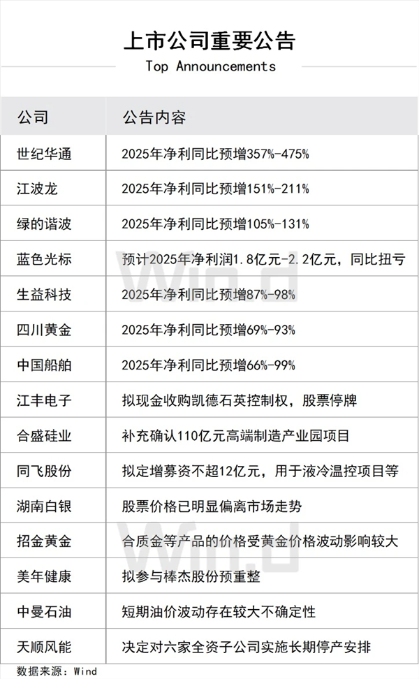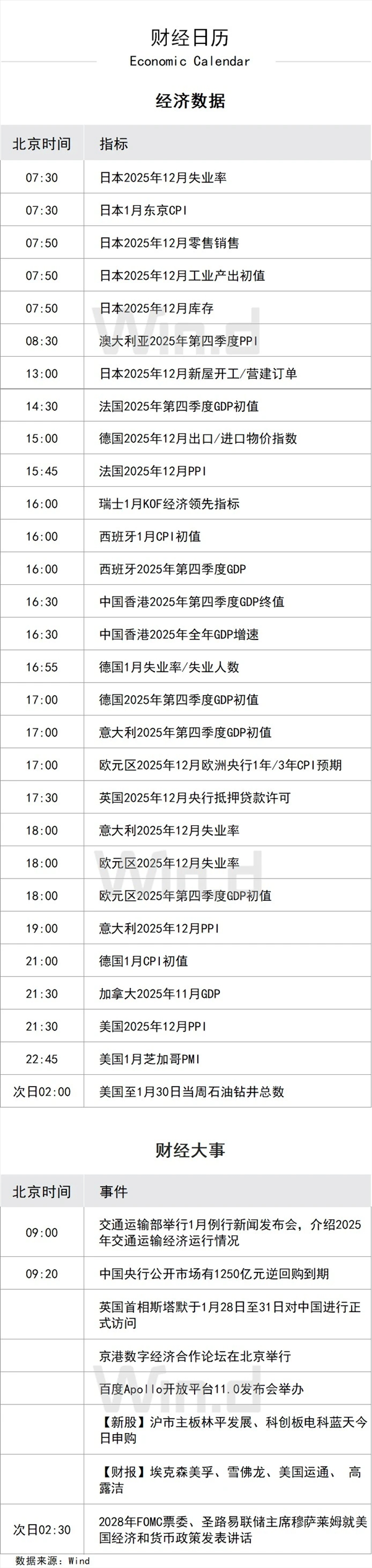 2、美国总统特朗普表示,鉴于严寒天气,俄罗斯总统普京已同意一周内暂停对乌克兰的空袭。他还表示,计划下周公布美联储下任主席提名。另外,美方计划重新开放委内瑞拉领空,多家美国大型石油公司将前往实地进行勘察。