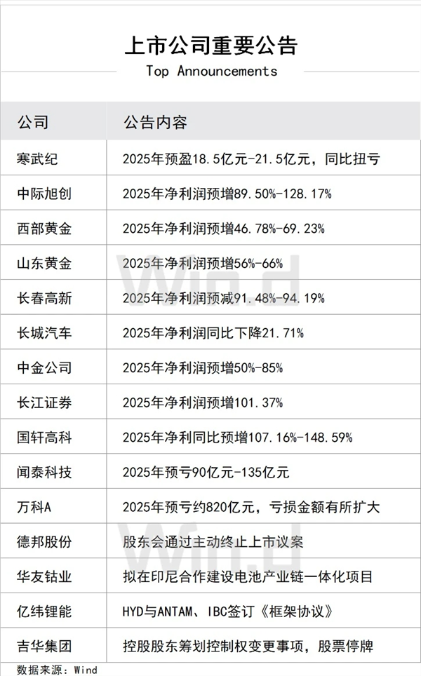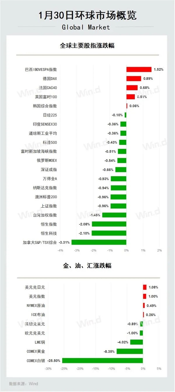 1、美国三大股指小幅收跌,道琼斯工业平均指数跌0.36%报48892.47点,标普500指数跌0.43%报6939.03点,纳斯达克指数跌0.94%报23461.82点。美国政府面临停摆危机、通胀压力及地缘政治风险等因素,加剧市场担忧情绪,压制美股表现。前美联储理事沃什获提名为下一任美联储主席,市场料其最终将不支持大幅降息,因此仍维持今年只有两次降息的预期。