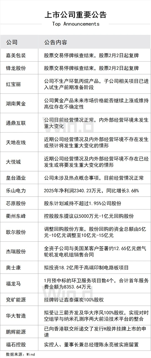 8、国投白银LOF发布公告,将于2月2日开市起至10:30停牌,自10:30复牌,复牌后的交易按照《深圳证券交易所交易规则》相关规定执行,价格涨跌幅限制比例为10%。