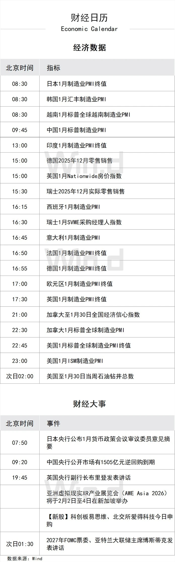 2、本周全球市场大事不断!国内方面,沪市首份2025年年报将披露;光伏、脑机接口等多个产业会议召开;中国1月外汇及黄金储备数据将于2月7日公布。国际方面,欧美多国1月PMI数据、美国非农就业报告将陆续出炉;欧洲央行、英国央行将公布利率决议;日本众议院选举定于2月8日举行;