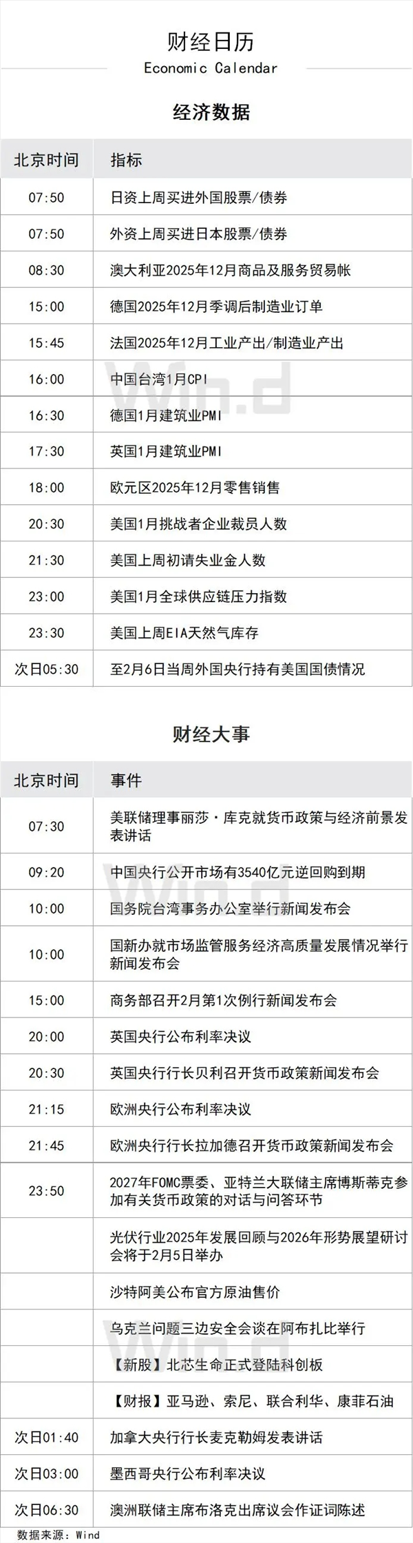 2、美国劳工统计局宣布,将于2月11日(下周三)发布1月非农就业报告,将于2月5日(本周四)发布职位空缺数据,重新安排2月13日发布1月CPI通胀报告。