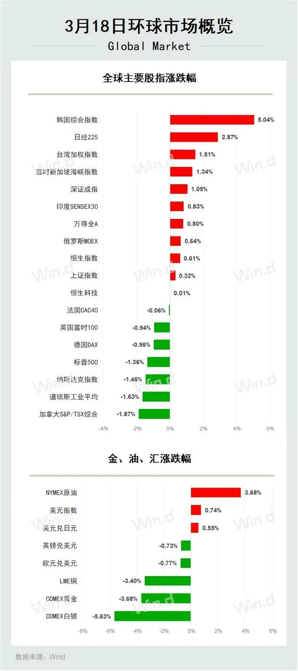 1、美油主力合约收涨3.68%,报99.05美元/桶;布油主力合约涨5.7%,报105.06美元/桶。中东局势紧张,相关能源设施遇袭后伊朗表明报复立场,且警告将打击中东多国能源设施,市场对原油供应端扰动的担忧升温,推动油价上涨。