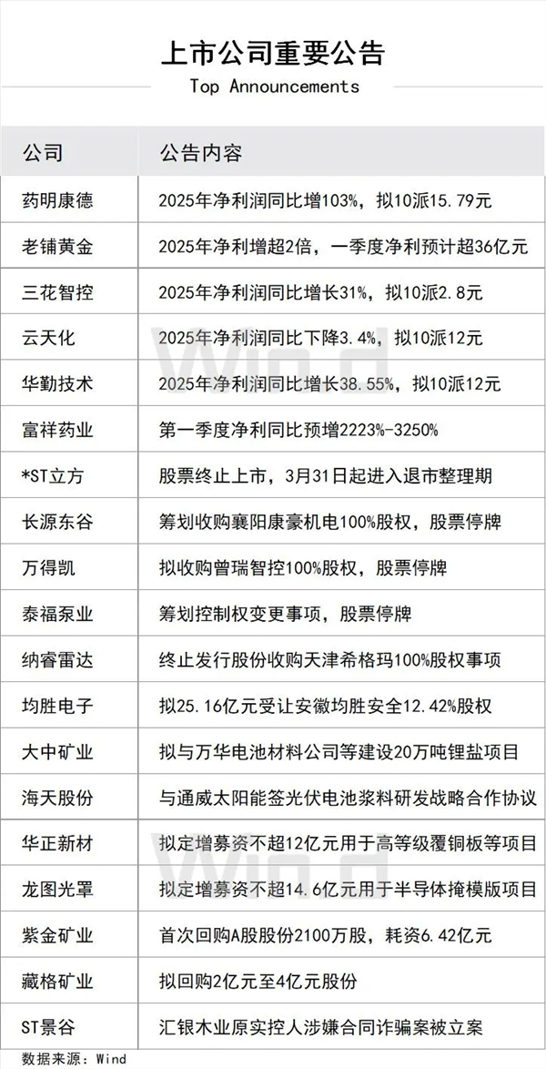1、美国三大股指全线收涨,道指涨1.38%报46208.47点,标普500指数涨1.15%报6581点,纳指涨1.38%报21946.76点。3M公司涨近4%,领涨道指;万得美国科技七巨头指数涨1.36%,特斯拉涨超3%,亚马逊涨逾2%;纳斯达克中国金龙指数涨0.86%,小鹏汽车涨超7%,蔚来涨7%。美国总统特朗普表示美伊双方已举行会谈,且他已叫停对伊朗发电厂及能源基础设施的打击行动,为投资者带来希望。